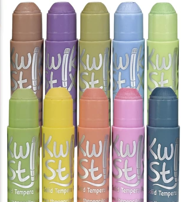 NEW! The softer side of Kwik Stix Solid Tempera Paint, 10 all new pastel shades! No cups, smocks, water or brushes needed. Great on poster paper, cardboard, wood and canvas - and MORE! Enjoy the same fast, 90 second dry time formula you love in this new pastel rainbow.