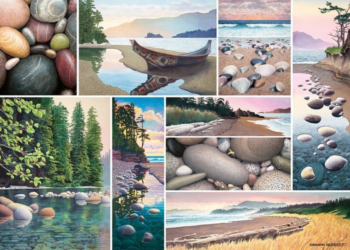 Relax into your personal puzzle nirvana with the quiet calm of this lovely collage! Illustrations of Canada’s west coast highlight nature scenes ranging from breaking ocean waves to peaceful inlets and coves. The pastel palette extends to the rocks, smoothed by centuries of waves tumbling away rough edges. The sleek lines of the canoe are a result of steaming the hull to widen it. Part of our Canadian Collection series — a tranquil puzzle sure to bring you hours of stress-reducing enjoyment!