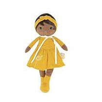 Here is Naomie, a pretty 9,75 inches doll with colourful tones. She is a very pretty young lady with a soft cotton muslin dress in sunny colours. Her daisy embroidery evokes innocence and candor, sweet omens for Naomie. Her loose dress and boots are perfect for frolicking in the daisy fields. Naomie reflects the carefree and joyful nature to be given to the toddler. It is a birth gift, elegant by its sobriety and its new material. Its small size allows it to be taken everywhere your baby goes. A long ribbon on the back allows you to write your name on it to make it unique. Machine washable. From birth.