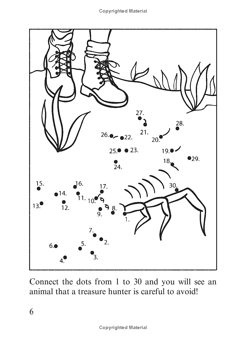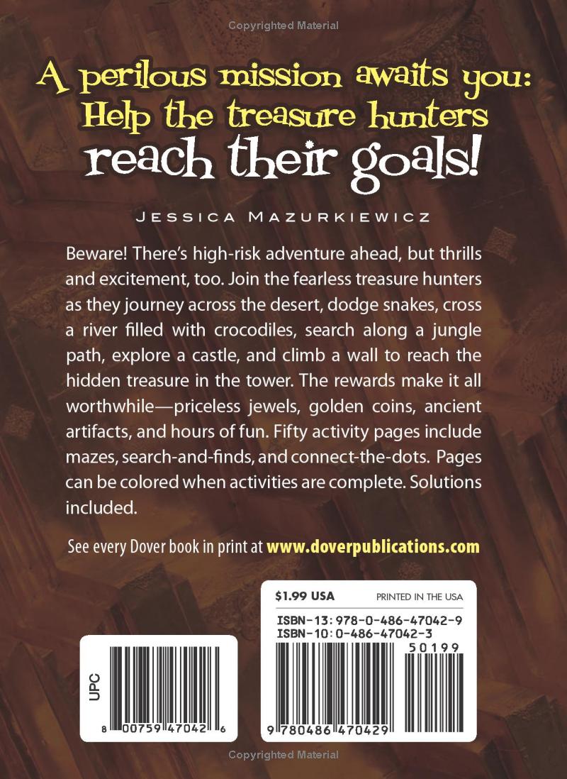 Beware! There's high-risk adventure ahead, but thrills and excitement, too. Join the fearless treasure hunters as they journey across the desert, dodge snakes, cross a river filled with crocodiles, search along a jungle path, explore a castle, and climb a wall to reach the hidden treasure in the tower. The rewards make it all worthwhile — priceless jewels, golden coins, ancient artifacts, and hours of fun. Fifty activity pages include mazes, search-and-finds, and connect-the-dots. Pages can be colored when activities are complete. Solutions included.