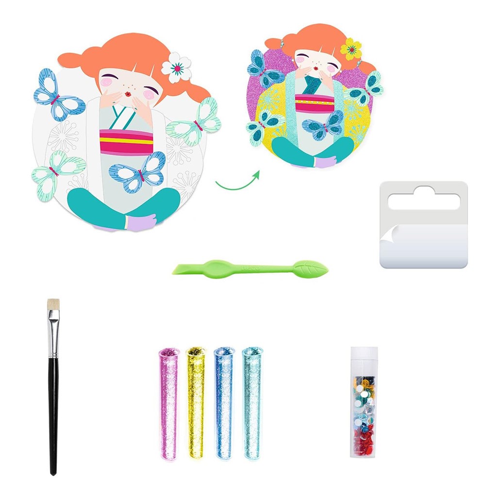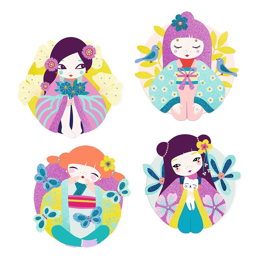 Children place the picture in the box, expose the pre-pasted areas, then place the rhinestones and sprinkle over the glitter following the color-coded instructions. To display their creations, children attach the small hanging hooks provided for this purpose to the back of the boards. Admiring the brightly shining dolls is a proud moment!