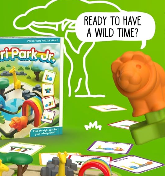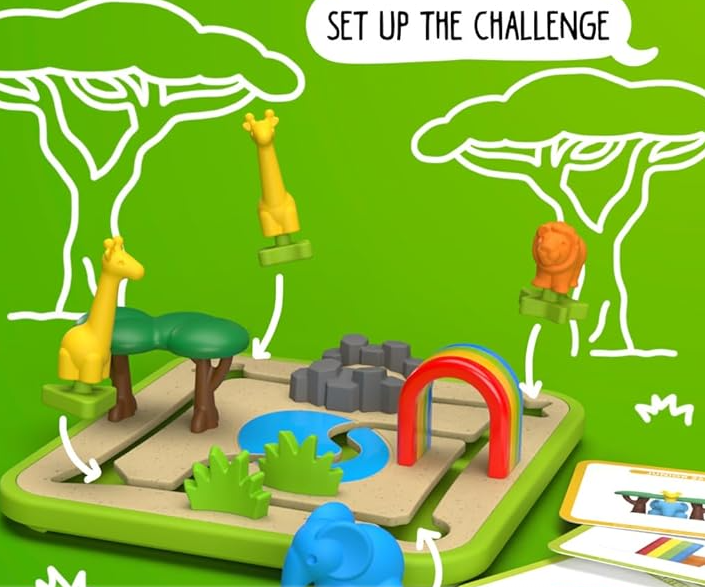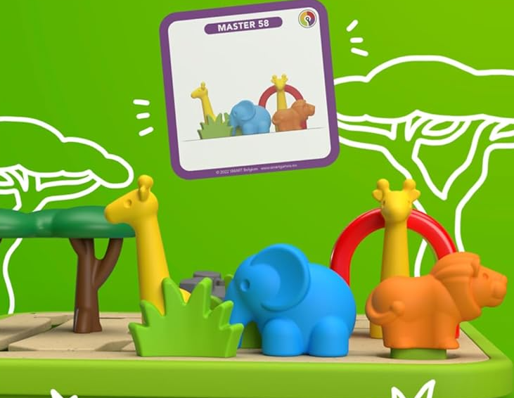 3, 2, 1 and pose! These safari animals love to model for the camera! Can you get the animals in the picture-perfect position for the snapshot? Move them around the board...but don’t forget the lion doesn’t like water, the elephant can’t climb over the rocks and the giraffes are too tall to fit underneath the trees! A 2-in-1 learning game: solve the puzzles or just play and let your imagination go wild! Learn about shapes and concepts as left, right, on top, in front, and behind. Sort shapes and follow the path. Ready to have a wild time?