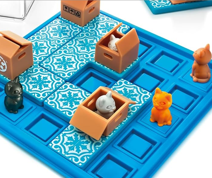 Are you clever as a cat? Move the puzzle pieces one by one until all cats are in a cardboard box. A puzzle game for kids and adults in a compact format, purrrrfect to take with you!