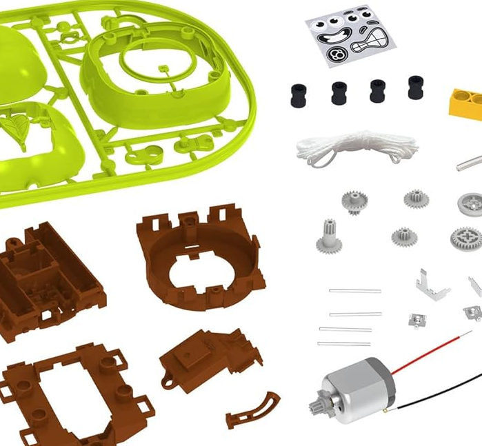 An apple that defies gravity and walks a tightrope — what would Isaac Newton have thought? Build a cute apple robot that walks along a tightrope. How? Thanks to the robot’s main component, a motorized gyroscope, it can maintain its balance and perform this fun trick without falling over. Through five experiments, you can discover the astonishing powers of the motorized gyroscope and explore the physics behind its amazing behaviors. Experiment with getting the gyrobot to walk on the different included tracks and on a string, investigate the gyrobot’s center of gravity, play a ring-toss game, and watch the gyrobot spin on a flat surface.