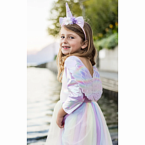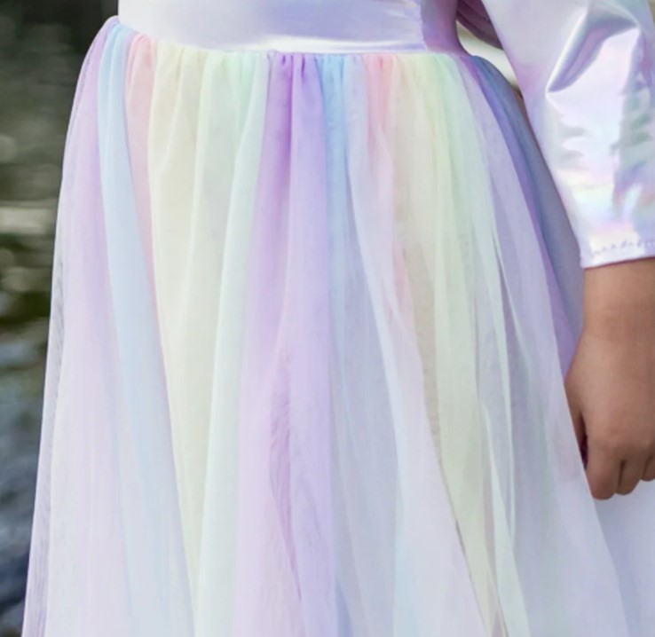 With shimmering hues that change with every movement, your child will feel like a real-life fairy-tale character in this stunning dress. The iridescent fabric captures the light like a unicorn's horn, creating a dazzling rainbow effect that is sure to turn heads and capture hearts.
