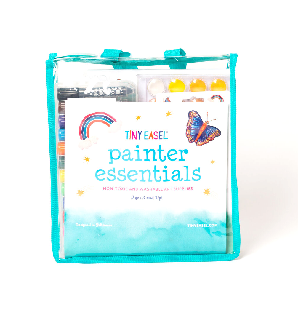 Includes watercolor paint, watercolor crayons, watercolor pencils, 6 paint brushes, 1 water brush wand, a canvas and easel, our volume 2 watercolor book and a canvas splat mat on the backside of the cover! For ages 3-12. All washable and non-toxic.