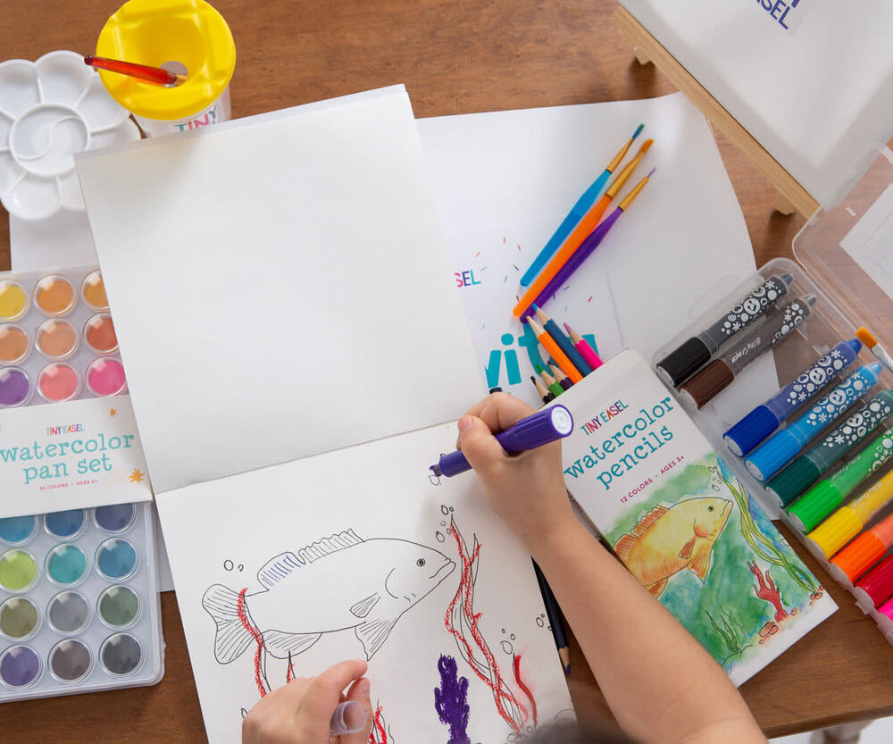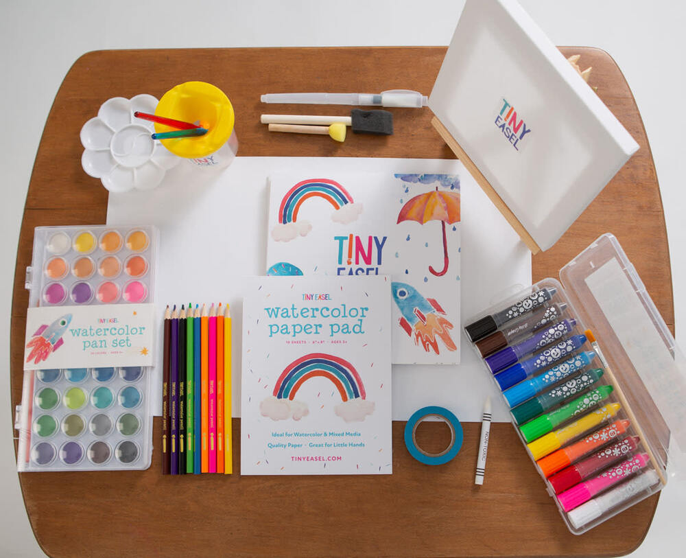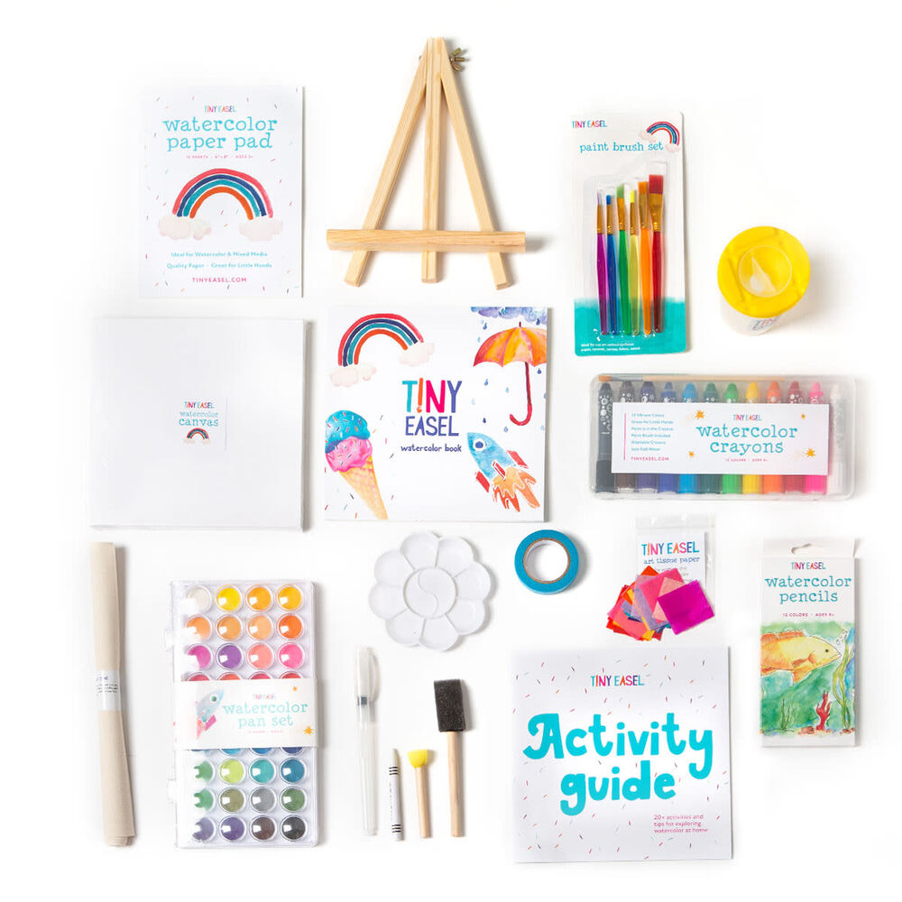 Our Tiny Easel Painter kit is an all-in-one art kit for your little artist to explore with watercolors. Why do we love watercolors for tiny painters? It’s stress-free for parents with great results! Plus, it’ll keep your kids occupied for a month and beyond. The paints are all washable, great for multiple-use, easy set-up and clean-up, and fun to work with.