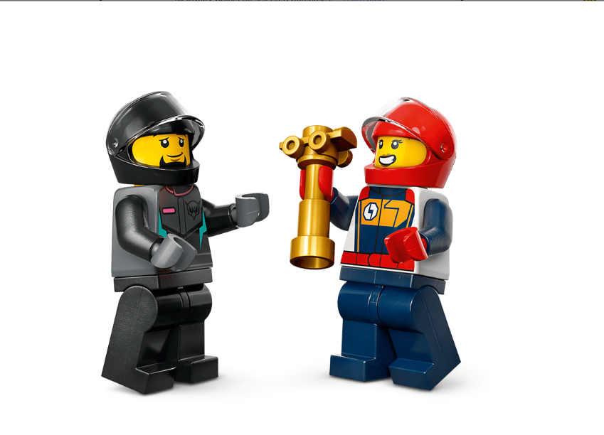 What’s in this toy playset? – Everything kids need to build a turquoise go-kart and an orange one, plus 2 race driver minifigures and a winner’s trophy element