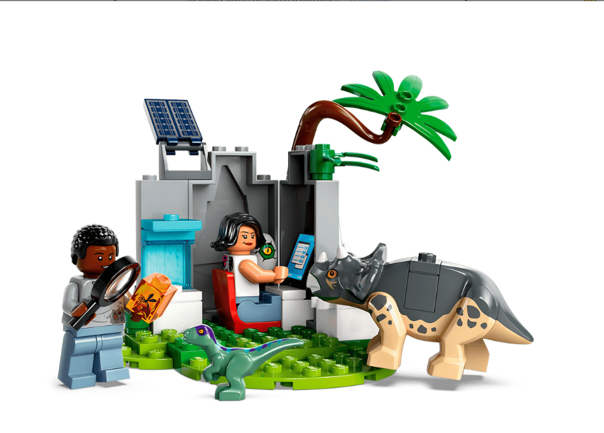 Dinosaur research center – The 5 dinosaur toy figures include a baby Ankylosaurus, Triceratops and Velociraptor, a small Velociraptor and an adult Pteranodon, plus Darius and Sammy minifigures