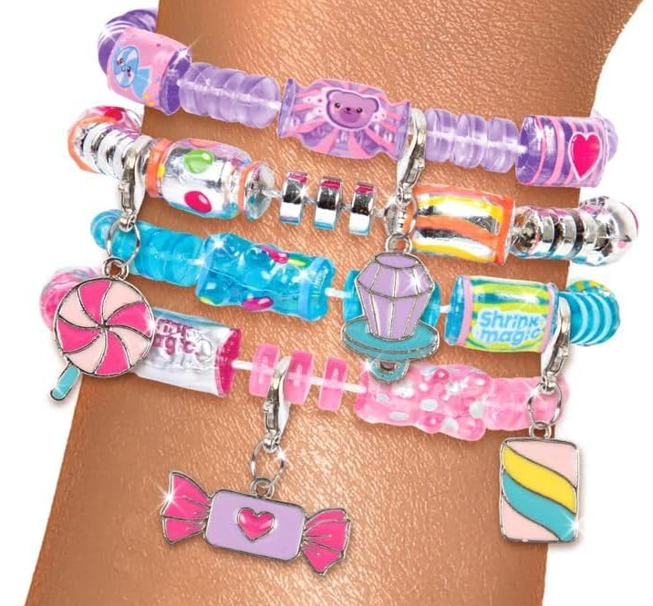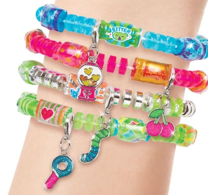 Select a bead strand. Choose candy design wrappers and align on the beads. Add heat and watch the magic happen! Make 4 bracelets. Includesenough design wrappers to repeat play 3 times over!