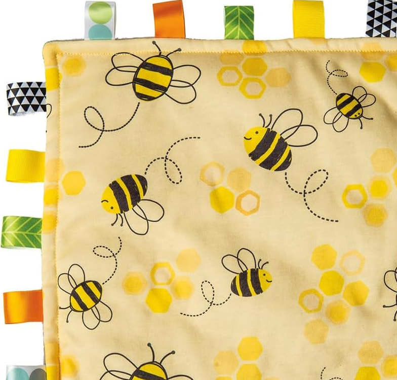 25 years ago, two moms discovered their babies loved to rub one tag on their blanket. With a little crafting and lots of entrepreneurial energy, they created Taggies: a 12" x 12" soft baby blanket with 20 looped ribbons. To this day, babies are mesmerized by Taggies! We love that they are portable and machine washable. This adorable modern bees pattern features a soft grey fabric on the other side.