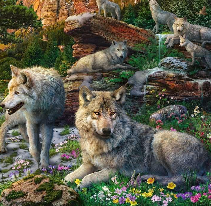 Did you know wolf pups are born blind and deaf and must be constantly cared for until they are about 10 months old? Our "Wolves in Spring" puzzle depicts this pack of grey Canis lupus taking their rest near a peaceful stream. Wolves are social creatures and have a complex system of communication that includes barking, growling, howling and body language. This pack is telling us they are a contented group — at least for now!