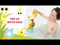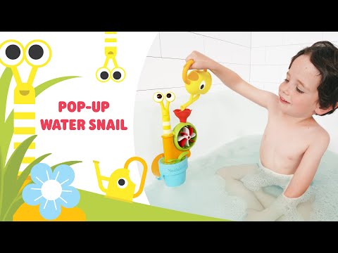 A garden themed bath toy- a flowerpot with a snail that pops up and a water mill that spins. Also includes a watering can that can be used to water the flower on top of the snail and set off a simultaneous surprising reaction.