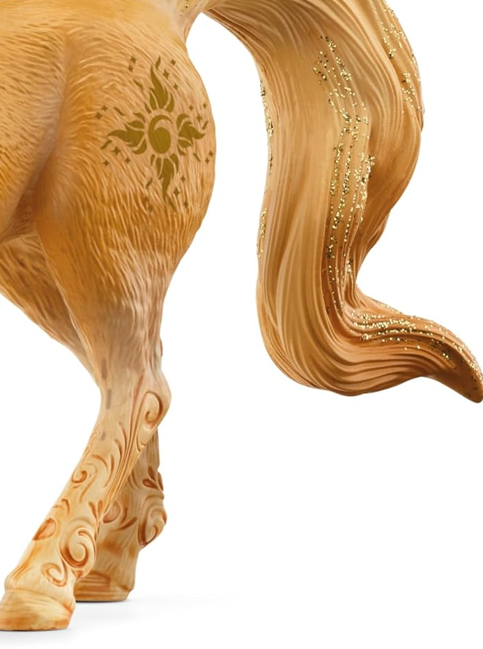 When the magnificent Apollo Unicorn Stallion appears with his shining golden comb, he is always the center of attention. His thick mane and lush tail glisten beautifully. His coat is adorned with a beautiful tattoo and there are pretty patterned swirls on its legs. What an eye-catcher!