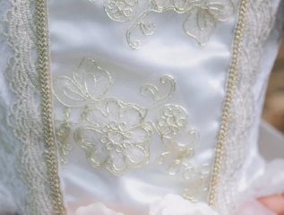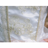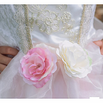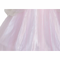 This absolutely stunning and elegant dress is designed with great attention to the finest details. The soft and silky skirt has a hoop and a shimmery top layer with a sparkly peplum. The crushed velvet bodice has a satin inset embellished with gold embroidery and finished with fancy golden trims. Elasticized waistband is adorned with pink and champagne-colored roses at the front. This gown is dreamy and it’s dream come true for all little princesses!
