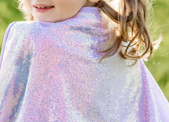 Proudly Made in Canada, this stunning cape is adorned with beautiful lilac sequins, making it shimmer and sparkle in the light. The Lilac Sequins Cape is designed with convenient and easy-to-use velcro closure, allowing children to quickly and easily put it on and take it off. The cape is also lightweight, making it easy for little ones to wear without feeling weighed down. Unforgettable and gorgeous, this cape is of course machine washable!