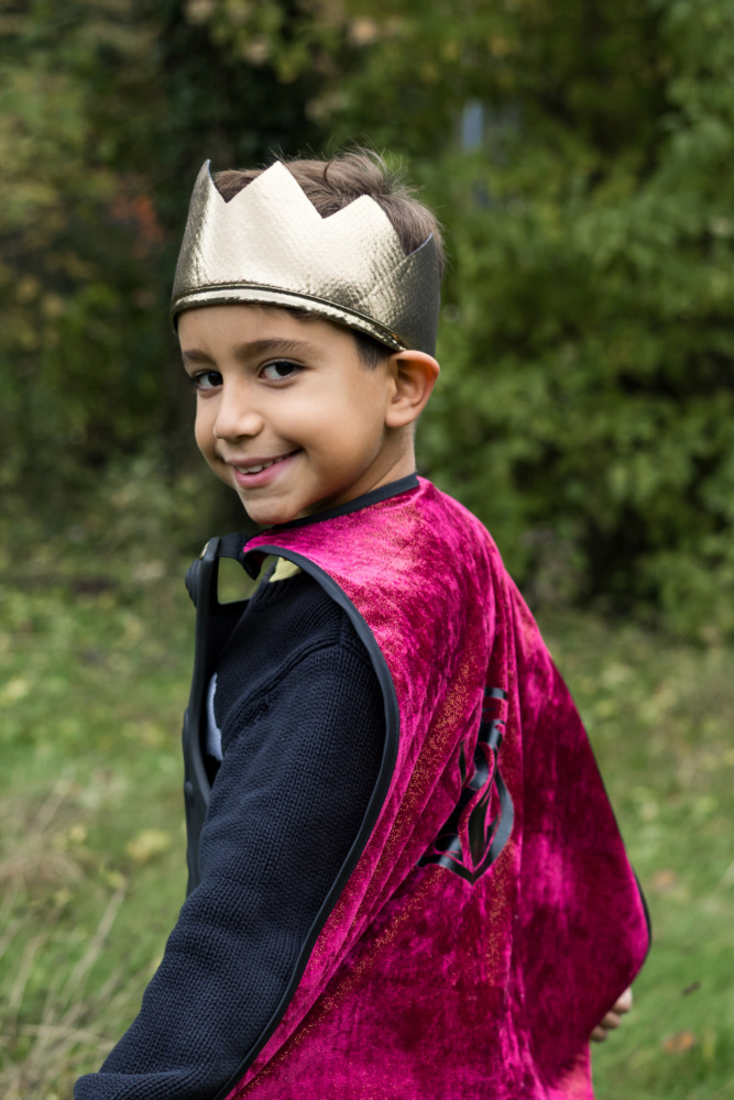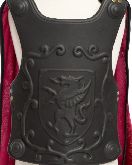 Attached to the chest plate is a regal crushed red velour cape, billowing with the grandeur befitting a heroic knight. As your child dons this ensemble, they'll be ready to defend kingdoms and conquer imaginary dragons with style. To complete the royal look, the set includes a beautiful soft gold crown, adding an extra touch of majesty.