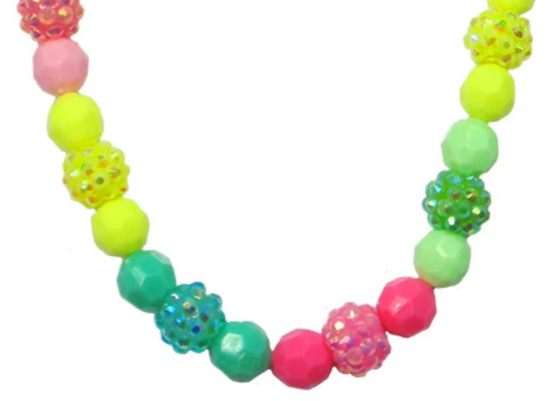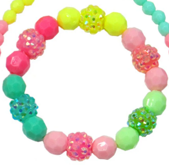 Perfect colour combinations of yellow, green and pink! These Vividly vibrant beads form a fun necklace bracelet set that is sure to wow! With studded bead accents and a high gloss finish, this set is perfect for any outfit!