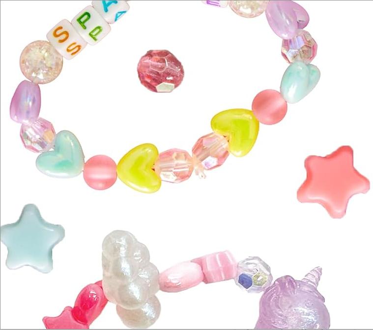 Contents Include: 1 Reusable plastic bead jar with colored lid, 10 Yards of white gel cord, 100s of Beads: frosted, iridescent, faceted, round, star, heart, 1 cloud and 1 unicorn, Alphabet beads and Instructions