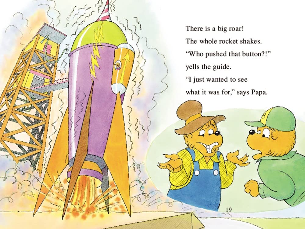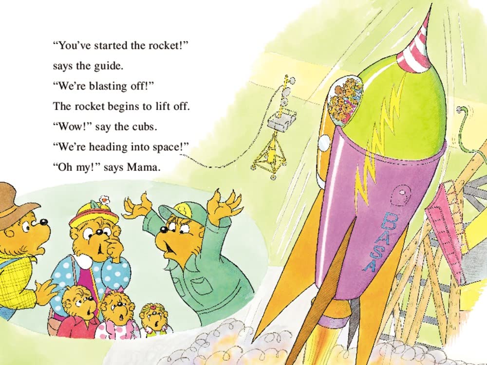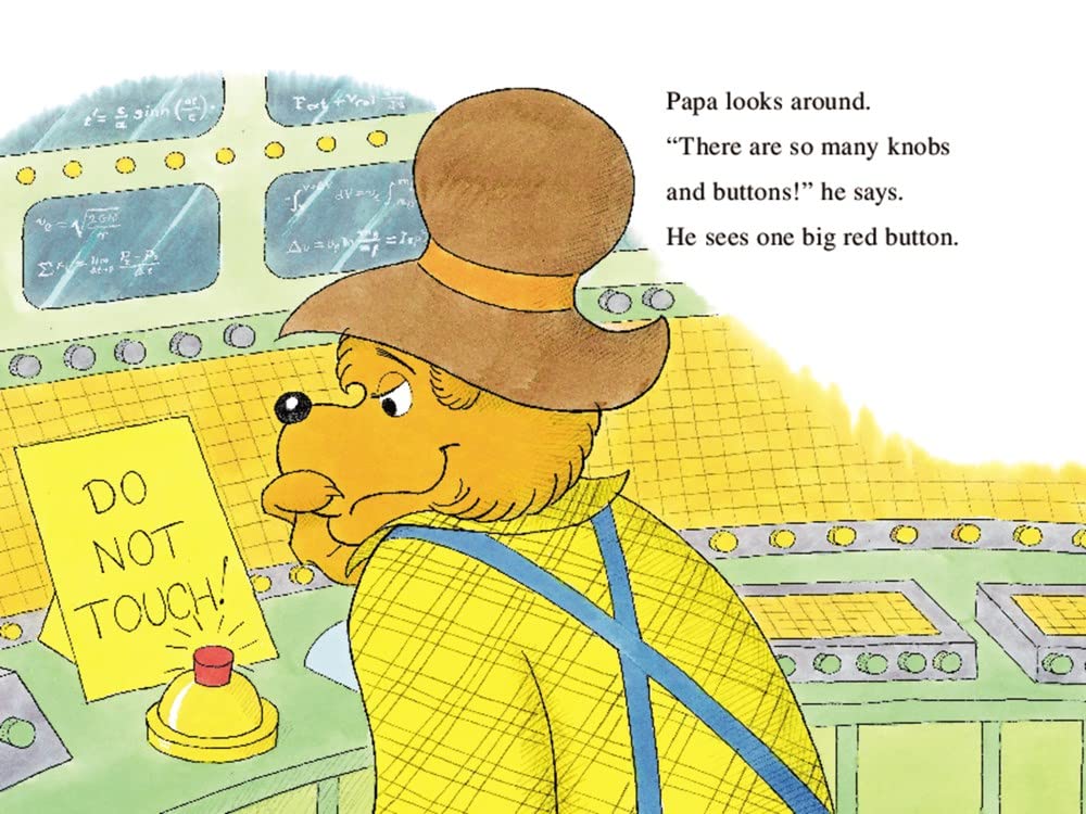 The Berenstain Bears can’t wait to visit the Bear Country Space Center, where rockets blast off into outer space! When the tour guide gives Mama, Papa, and the cubs a tour of the Big Bear Space Rocket, he makes it very clear not to touch anything. But when Papa sees a big red button, he just can’t help himself. Get ready to blast off!