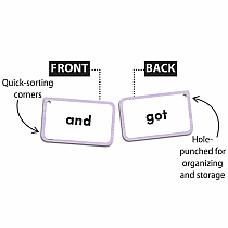Each flash card set contains a collection of full-color, high-interest student cards as well as instructions and tips for the teacher or parent, suggested activities, and additional blank cards. Each card has a hole in the top corner that can be fit with a ring or string to help with organization and storage. Additionally, each card has one corner that is shaped differently than the others. By lining up the non-rounded corners, the flash cards can quickly be faced in the same direction. When applicable, flash card sets include answers in small print on the reverse side of each card. Each card measures 3⅛" x 5⅛". 56 double-sided cards per pack.