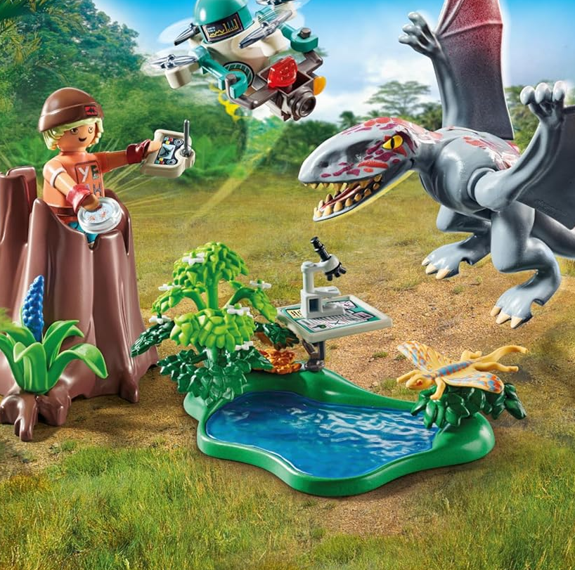 • Cool PLAYMOBIL Dinosaur set featuring a PLAYMOBIL figure, a Dimorphodon, a flying reptile, a drone with a camera, a microscope, a pond with plants, and many other fantastic extras.