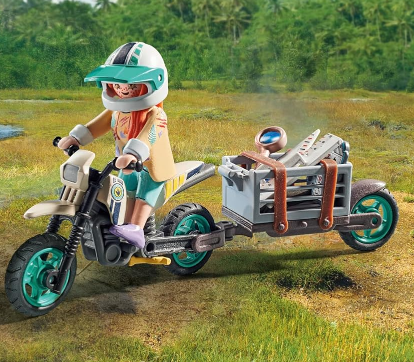 • Includes a knowledge card with fascinating dinosaur facts. Figures: 1 woman; Animals: 1 Tyrannosaurus rex; Accessories: 1 motorbike with trailer, 1 puddle with footprint, 1 branch, instruments for measuring, 1 clipboard, 1 pen, 1 spanner, 1 magnifying glass, 1 camera, 1 map, bones, excrements; 1 dinosaur knowledge card