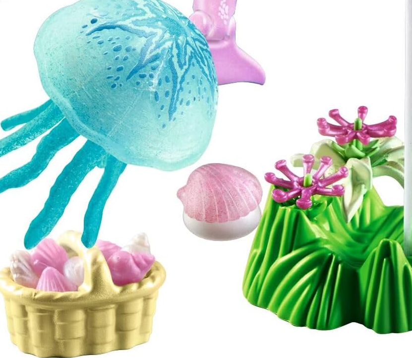 Dive into fun adventures with the Little Mermaids with Jellyfish from PLAYMOBIL. On the ocean floor, the two mermaid children search for shells and collect them in their basket. Curiously, they watch the two large jellyfish swimming by in the distance. The Princess Magic Mermaid World by PLAYMOBIL invites children into a magical underwater realm. The lovingly crafted figures and animals inspire children aged 4 and up to embark on ever-new imaginative adventures. The play figure set includes two child figures, two jellyfish, sea flower, underwater plant, basket, and many other fantastic extras. The jellyfish can be attached to transparent rods for "swimming. Figures: 2 little mermaids; Animals: 2 jellyfish; Accessories: 1 sea flower, 2 blossoms, 1 underwater plant with flower, 1 basket, 2 decorative shells with suction cup, 8 mini shells, 2 transparent bars