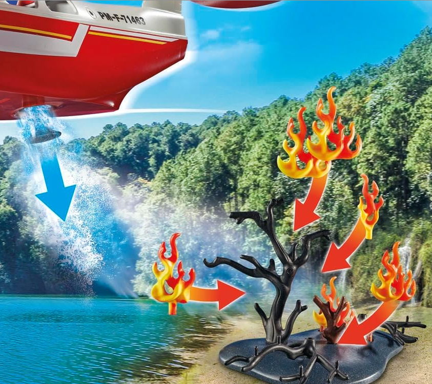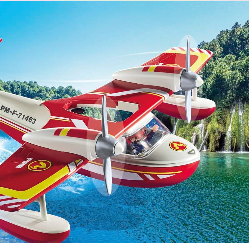 Embark on thrilling rescue missions with the new PLAYMOBIL Firefighting Seaplane with Extinguishing Function! This heroic set from the PLAYMOBIL Action Heroes play world makes children's hearts race with excitement. Thanks to its clever design with buoyancy aid and floats, the plane effortlessly floats on water. The rotating propellers give the aircraft dynamism, while the optional loop at the front of the nose opens up creative play possibilities. Inside, there's room for a figure, ready for exciting missions. The innovative water-dropping function allows the plane to collect water in the water and release it in the air – an interactive experience for young firefighting heroes! The PLAYMOBIL Firefighting Seaplane is an ideal gift or surprise for adventurous children aged 4 and up. Figures: 1 fireman; Animals: 1 cougar, 2 squirrels; Accessories: 1 helmet, 6 flames, 1 base plate, 4 plants