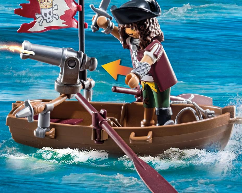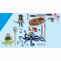 Beware, for the giant octopus is approaching! The pirate is trying to escape in his rowboat, but the giant squid and its companion Deepers are faster. They catch up to the boat, and the octopus gives the pirate a cold shower with its tentacle. The pirate doesn't even have time to load his cannon. It's better not to mess with this extraordinary sea creature! With imaginative characters and detailed equipment, the Pirates playsets from PLAYMOBIL offer hours of fun for pirate fans aged 4 and up. The giant octopus has a water-spraying function. The pirate boat floats and can accommodate one PLAYMOBIL figure.