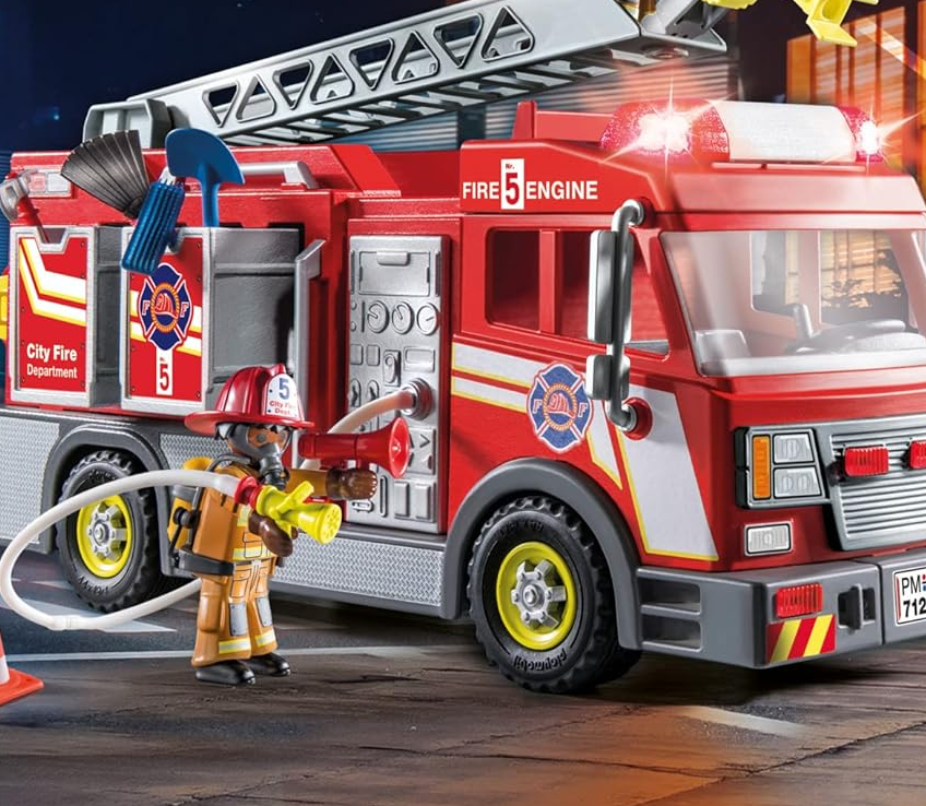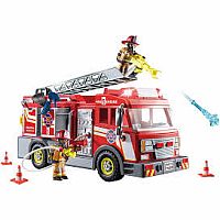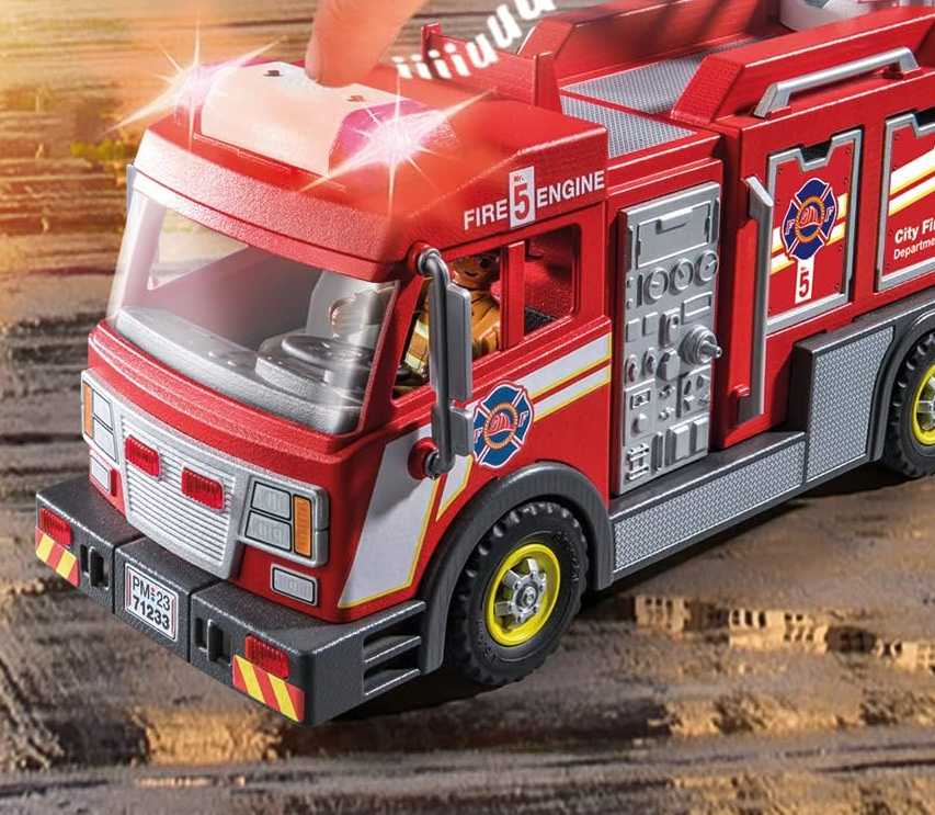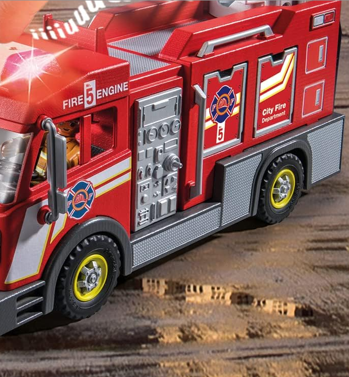 Be a hero in PLAYMO City with the PLAYMOBIL Fire Truck, featuring an extending ladder that spins 360 degrees and a rotating and swiveling water cannon to knock down the flames. The set includes four water arrows. Equip your figures with a respirator and oxygen tank for the rescue mission. Use the large compartments on both sides of the vehicle to store the mission equipment. Includes 2 PLAYMOBIL figures. Accessory elements include a fire hose, megaphone, radio, oxygen devices, fire axe, water cannon, broom, 3 pilons and a fire arm. 1 x AAA battery required. Dimensions: 12.2 x 4.9 x 14.3 in (LxWxH) (with ladder) Recommended for ages four to ten years. Warning. Choking Hazard. Small parts. Not for children under 3 years.