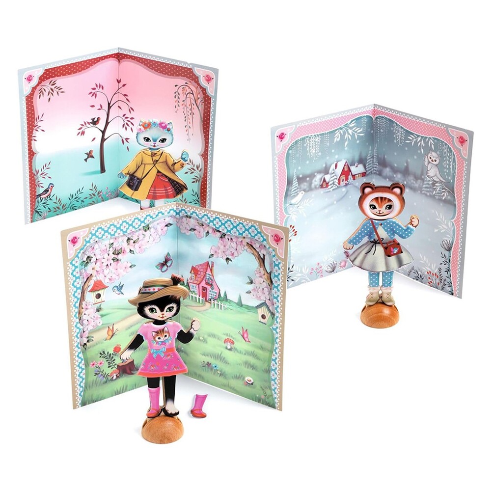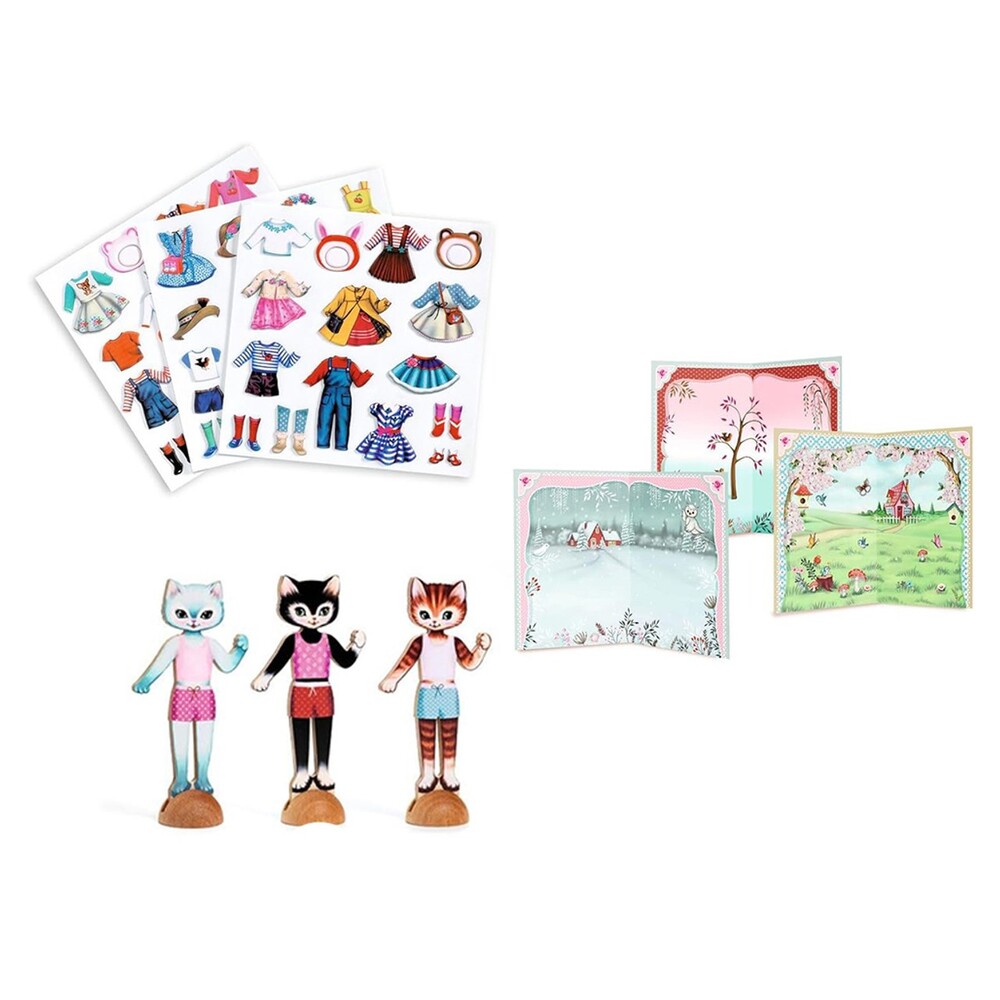 Contents: 3 wooden cats with stands (11.5cm high), over 65 sturdy reusable stickers (3 sheets), 3 cardboard scenes and a step-by-step instruction booklet.