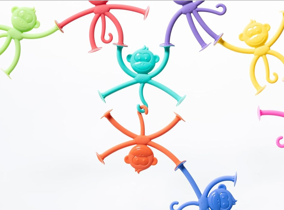 Babies go bananas for these monkey-shaped teethers! Each pack comes with 6 colorful HangaTangs made of textured food-grade silicone. Their hands and feet have suction cups - stick them to surfaces or link them together! We love the versatile play opportunities on high chairs, strollers, in the tub or the car.