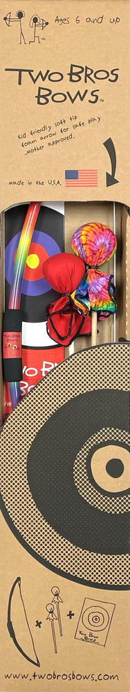 Hand assembled in the USA and third party tested for safety, set comes with bow, two color-coordinating arrows, and a target to hang for practice. All in an incredibly giftable natural cardboard box!