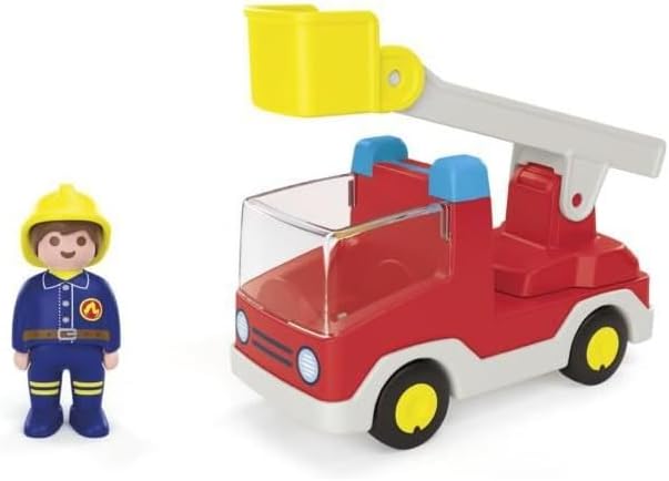 Rush to the scene of the fire with the Ladder Unit Fire Truck. With a bright and colorful design and large, rounded pieces, this PLAYMOBIL 1.2.3 set is ideal for toddlers. The ladder with bucket swivels, making it easier to access those hard-to-reach fires. Set includes one figure and one fire truck. Recommended for ages 18 months and up.