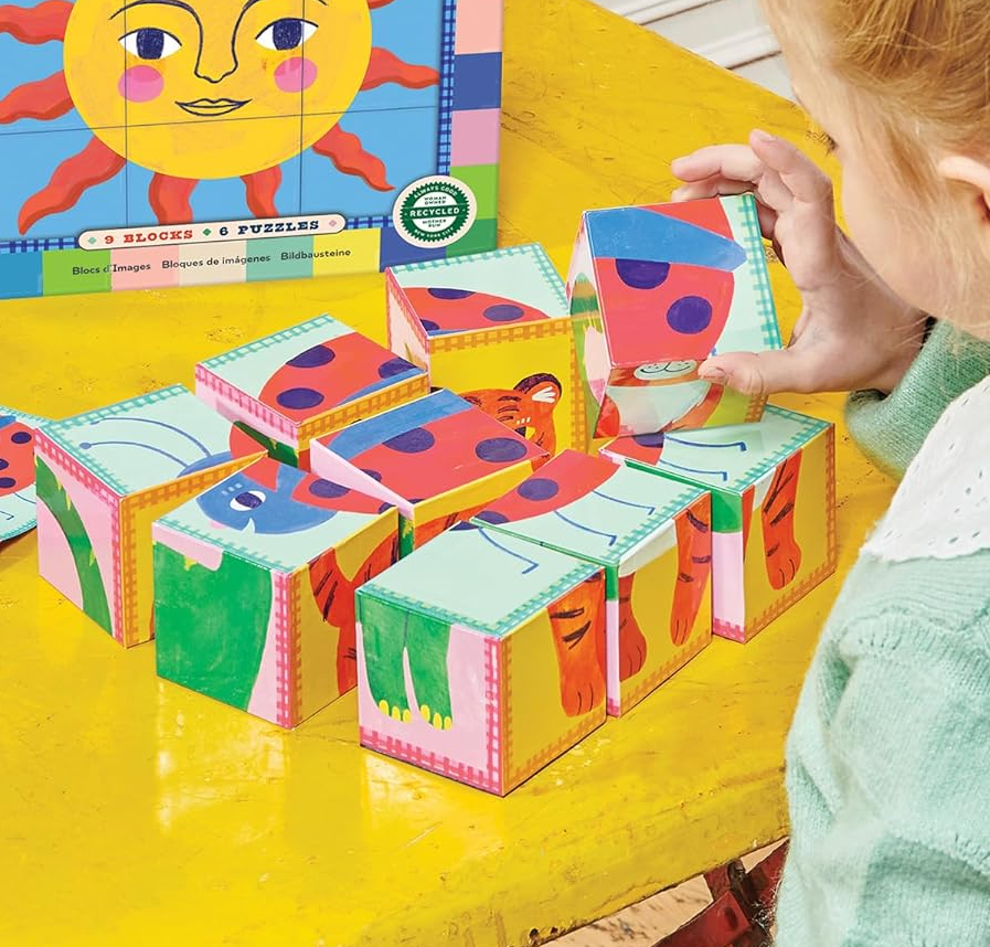 Develops cognitive, fine-motor skills, and visual literacy. Blocks that make 6 brightly colored puzzles: Ladybug, Tiger, Whale, Sun, Snail, and Dinosaur. Created in collaboration with educators, psychologists, parents, artists, and other experts. Sustainably Sourced: Made with recycled board and printed on FSC®-certified paper using vegetable-based inks