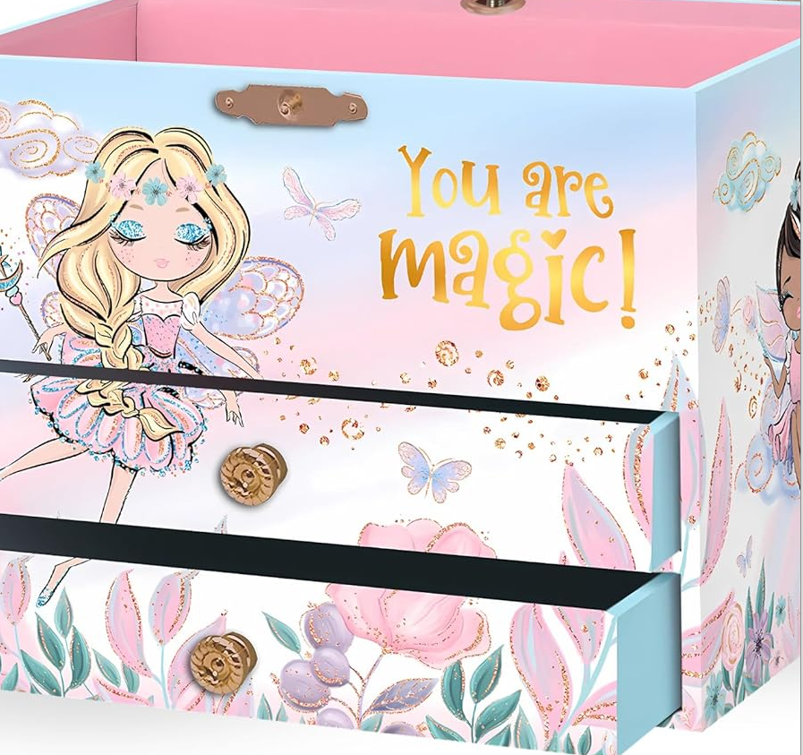 Fine Craftsmanship - Made with sturdy pine fiberboard & tested for safety, this jewelry box for kids is built to last. The spinning fairy music box for girls complies with all CPSIA, ASTM, and EN71 guidelines ensuring the wellbeing of any child.