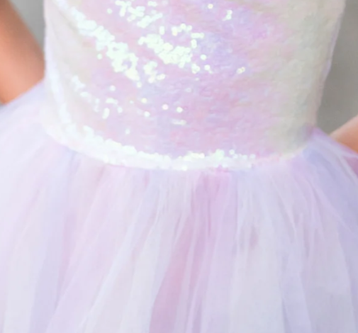 The top of the dress is adorned with mesmerizing iridescent sequins that shimmer and shine, creating an ethereal effect reminiscent of a unicorn's magic. A dainty bow at the waist adds a touch of sweetness and charm, enhancing the overall grace of the outfit.