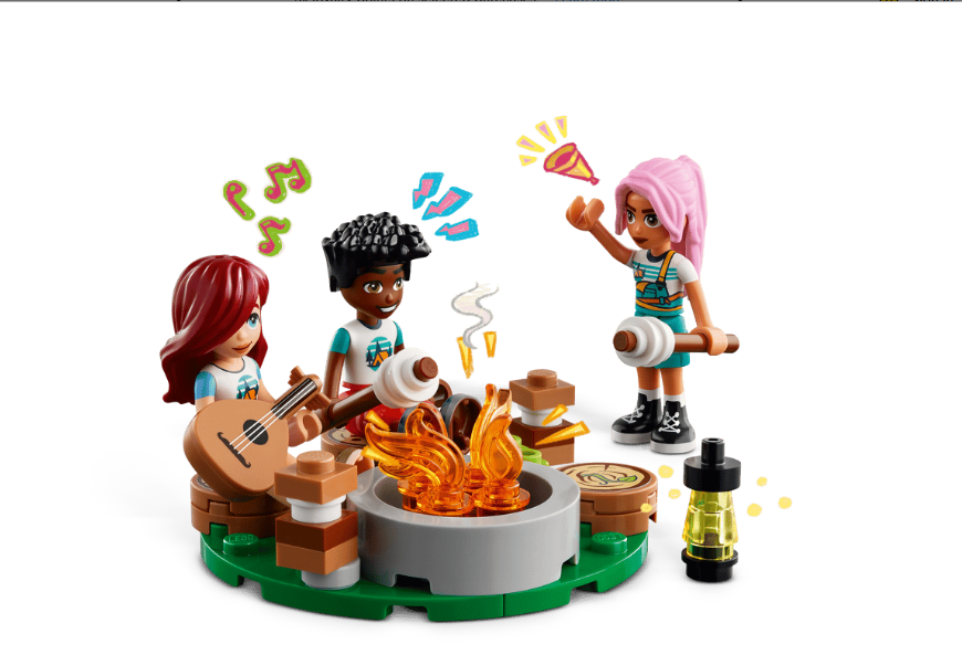 This LEGO toy building set for kids makes imaginative pretend play so much fun. Young builders tell the story of Paisley, Zac and Sky as the friends enjoy a cozy camping trip. The set includes 2 buildable shelters with roofs that lift for easy access. The friends put the sleeping bags inside, ready for nightfall. Then Zac and Sky ride the 2 mountain bikes while Paisley writes songs on the lute. In the evening, the friends relax by the campfire, where they toast marshmallows and make the traditional campfire treat – s’mores.