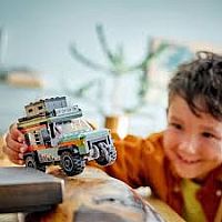 Vehicle set packed with LEGO® minifigure accessories – Includes a toy camera, water bottle, flashlight, map, compass, binoculars, tools and a first aid kit for pretend play