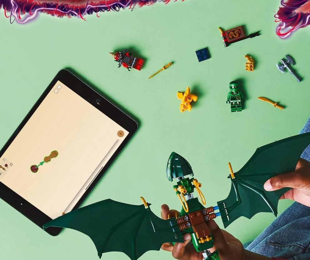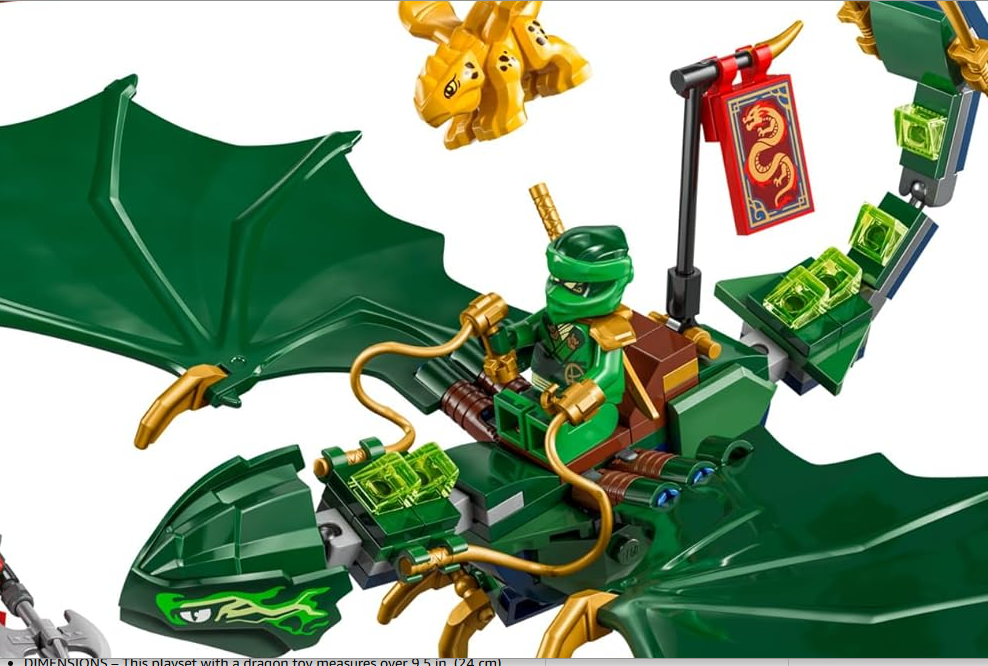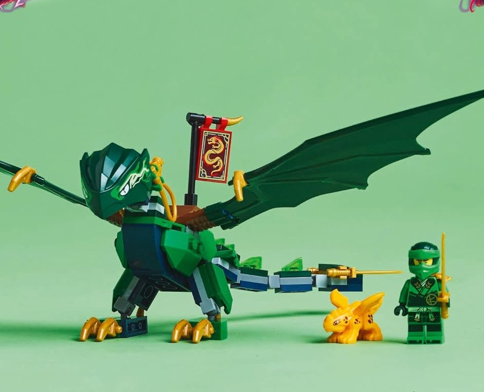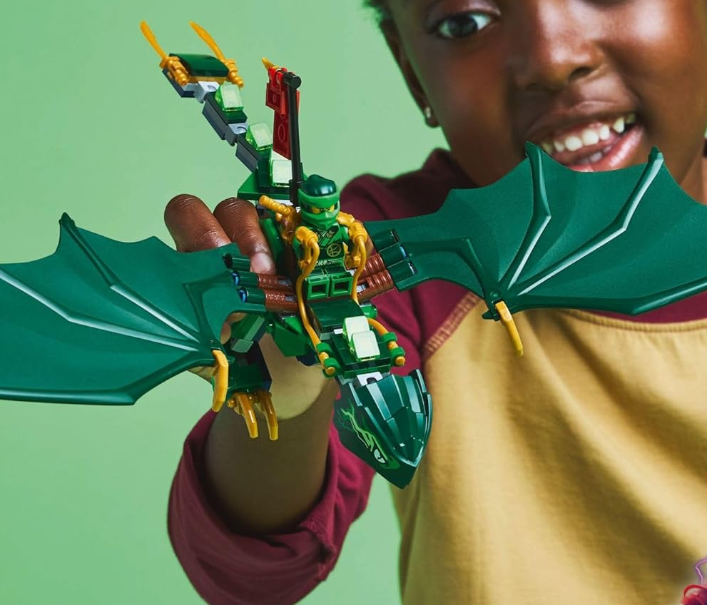 Posable NINJAGO® dragon – A buildable model of Lloyd’s Green Forest Dragon with a posable tail, neck, legs, hands and large wings, plus a saddle so a minifigure character can ride on its back
