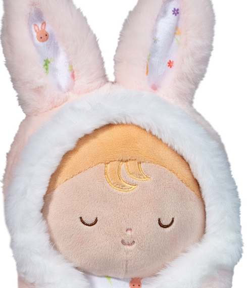 Brimming with sweetness and charm, this interactive soft toy is designed to capture Baby’s imagination while offering endless comfort. Gently wrap the Baby doll within the soft, plush swaddle for cozy naps or snuggles. The easy-to-use closure is accented with an embroidered pink paw print, while a pair of adorable bunny ears peek out from the hood. A fluffy white tail completes the bunny look. Soft, soothing textures and embroidered baby-safe features make this cuddle toy as perfect for nap time as it is for playtime.