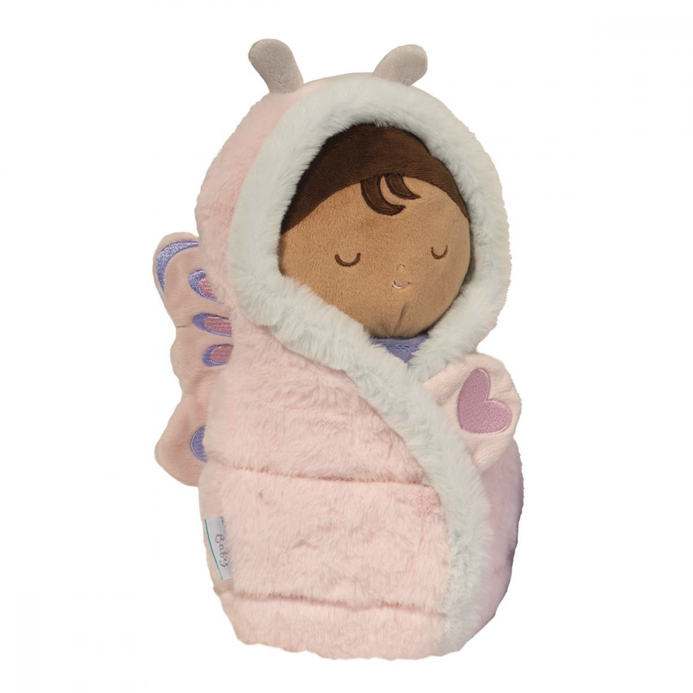 Our Baby Butterfly Hug has been designed with creativity in mind and encourages interaction with its soft textures and innovative concept. Squeezably soft and dressed in a gentle indigo color, Baby fits comfortably inside her matching Butterfly themed swaddle accessory. Detailed with a heart embellishment, the swaddle can be wrapped snugly around Baby with its simple to use closure. A pair of antennae and patterned butterfly wings will inspire little minds and spur on flights of fancy for them and Baby Butterfly Hug to share!