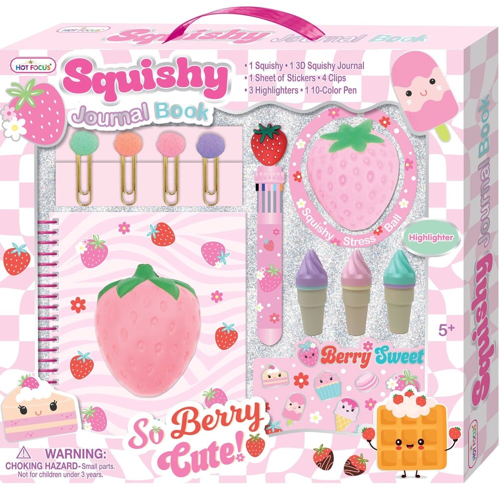 This set includes a squishy strawberry journal for doodles, notes, and creative thoughts, a multi-color pen with a glow-in-the-dark strawberry topper, three tiny ice cream cone highlighters for colorful creativity, four pom-pom paper clips to keep things organized in style, and one sheet of sweet treat stickers for decorating and personalizing. Perfect for organizing, journaling, and adding a sprinkle of fun to every writing moment. A delightful gift for any little writer or stationery lover!