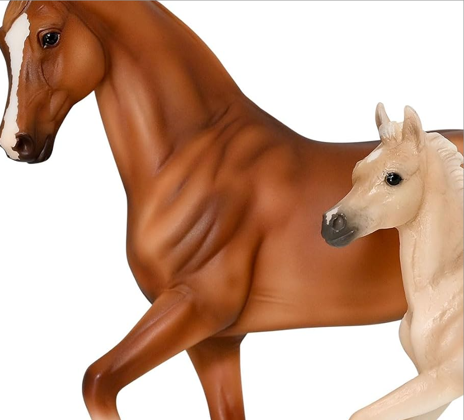 This set features a stunning chestnut stallion and his energetic palomino foal.