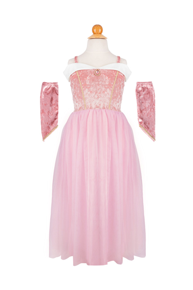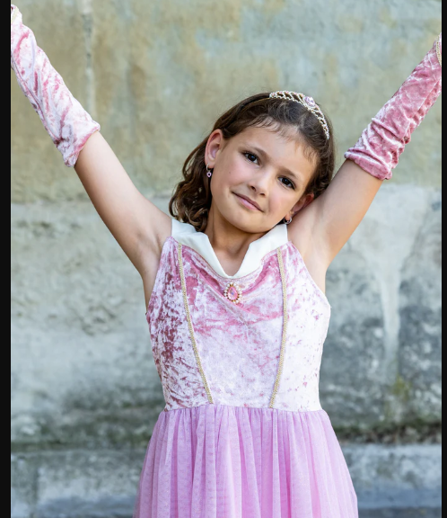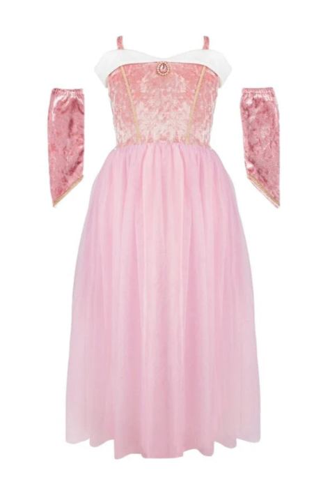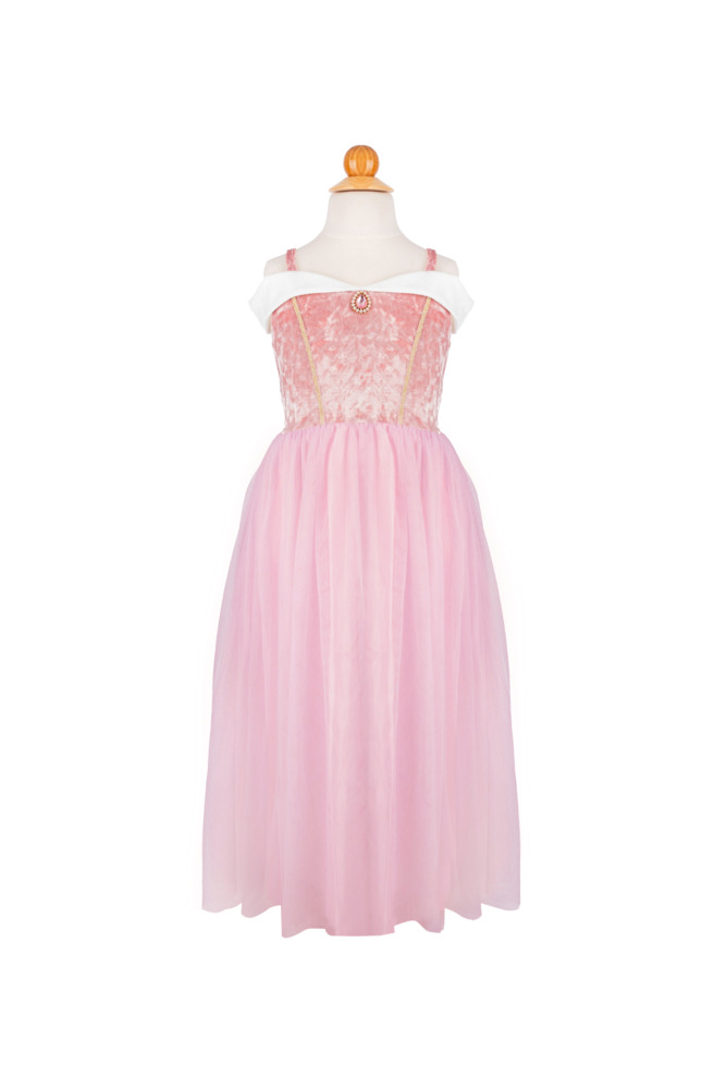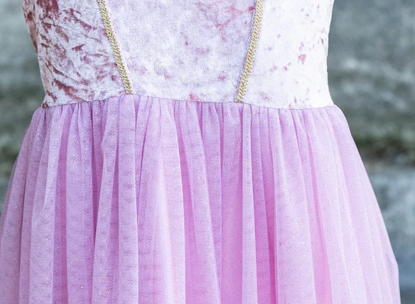 This enchanting gown features a soft, crushed pink velvet top with delicate spaghetti straps and a beautiful white trim along the chest, just like the iconic dress. The stunning pink gem at the center of the chest adds a touch of royal sparkle.