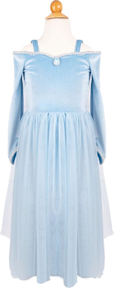 The light blue velvet top offers a soft, luxurious feel, while the spaghetti straps and off-the-shoulder long sleeves add a touch of elegance. The top is beautifully trimmed with silver accents and features a sparkling blue gem in the center of the chest, adding a royal flair. The dress is completed with a mesh cape attached to the back, printed with shimmering crystals for an snow princess-inspired look that will leave everyone in awe. The full-length skirt, made of soft tulle allows for twirling and dancing with grace. Perfect for any princess occasion, this dress is sure to make your little one feel like they’re part of an unforgettable fairy tale!