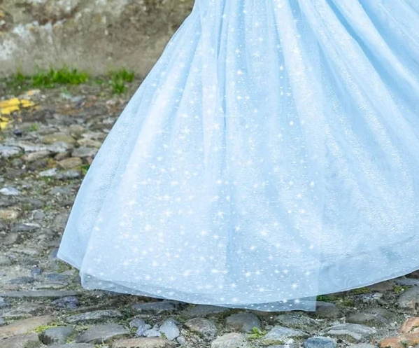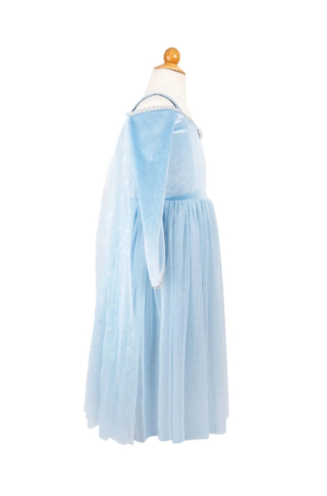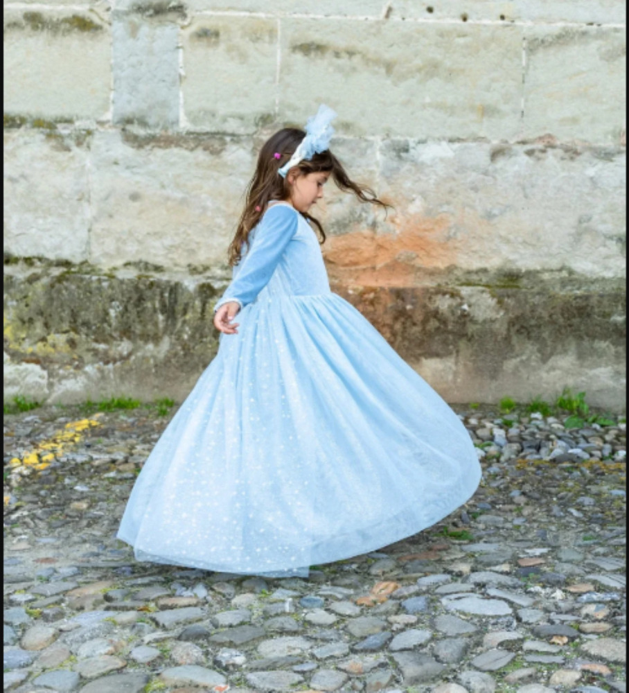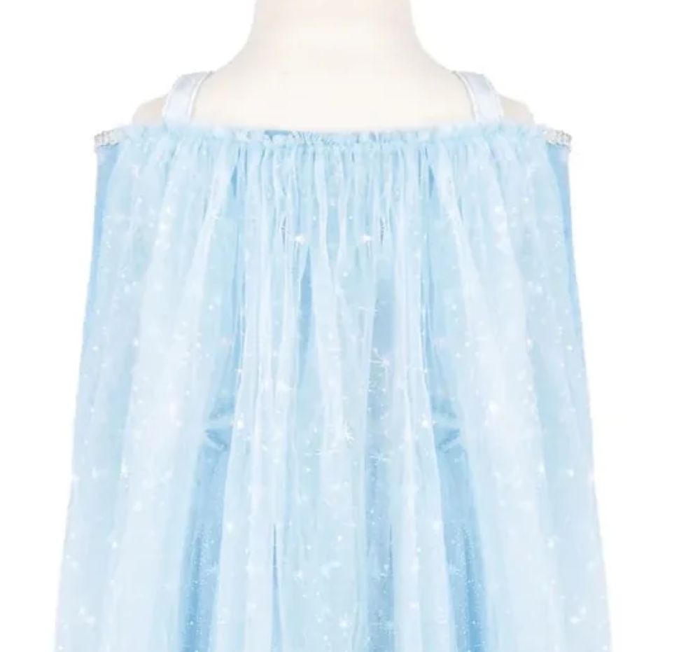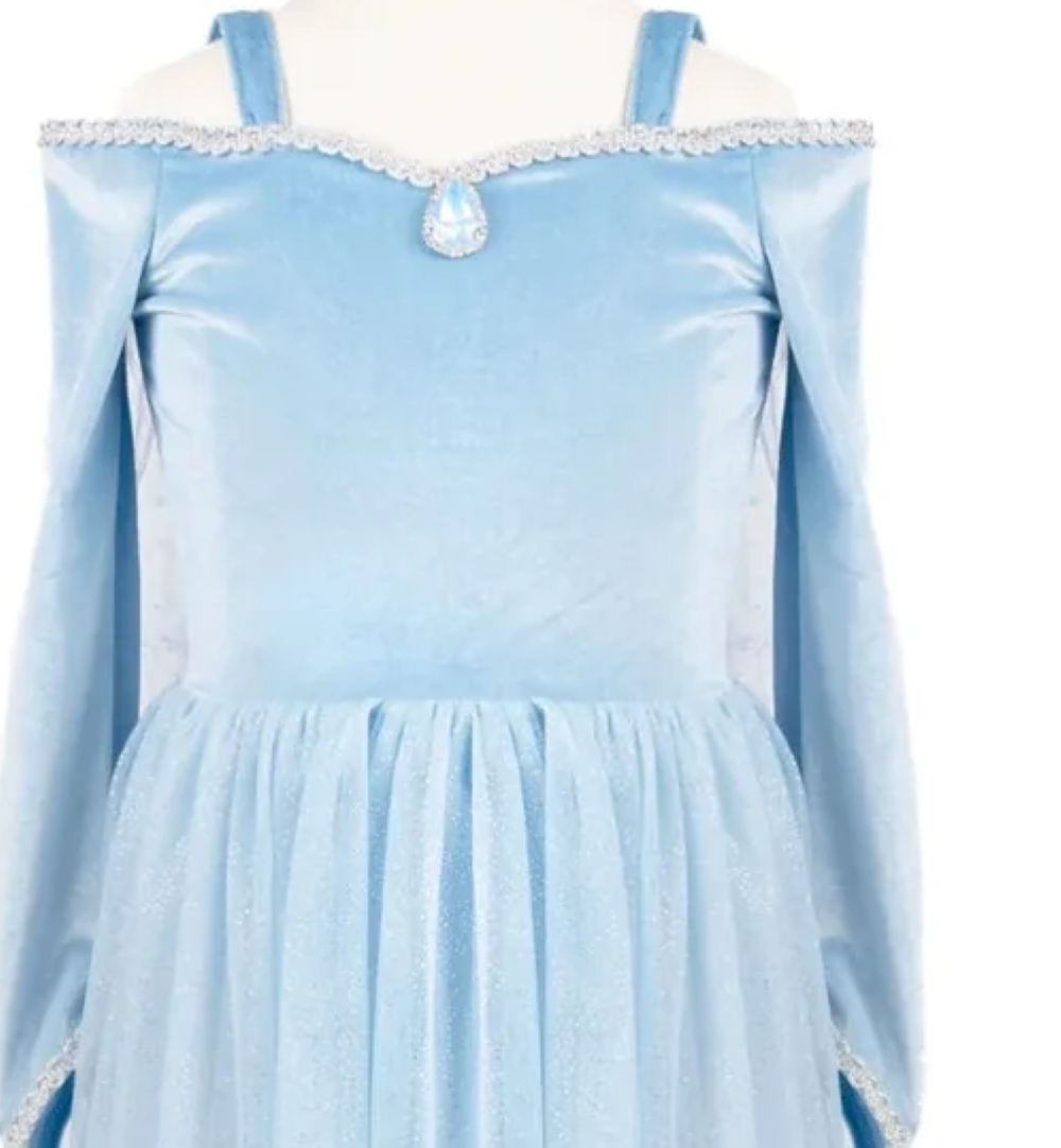 The light blue velvet top offers a soft, luxurious feel, while the spaghetti straps and off-the-shoulder long sleeves add a touch of elegance. The top is beautifully trimmed with silver accents and features a sparkling blue gem in the center of the chest, adding a royal flair. The dress is completed with a mesh cape attached to the back, printed with shimmering crystals for an snow princess-inspired look that will leave everyone in awe. The full-length skirt, made of soft tulle allows for twirling and dancing with grace. Perfect for any princess occasion, this dress is sure to make your little one feel like they’re part of an unforgettable fairy tale!