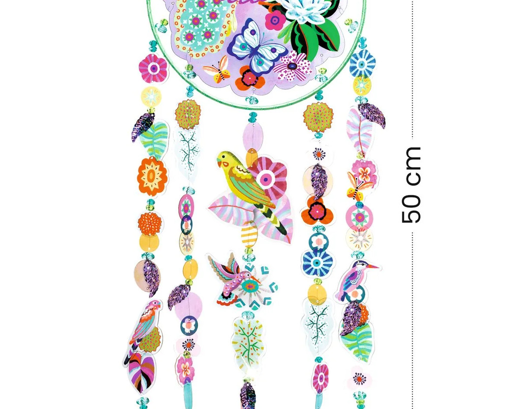 A beautiful decorative object that you can hang in your bedroom near a window to catch the light and add a touch of Feng Shui to your home. For creation made easy, the hoop is already wrapped in ribbon. Comes with semi-transparent illustrations, coloured faceted beads and glittering rhinestones, all designed to catch the light. The step-by-step instructions provided will help your child create. Set includes more than 80 decorative shapes, 1 metal hoop wrapped in ribbon (16 cm diameter), 1 assortment of faceted beads and sequins, 4 m of transparent thread, 1 sheet of transparent self-adhesive discs and 1 sheet of step-by-step instructions. FSC® certified cardboard packaging. Suitable from 7 years. Warning! Not suitable for children under three years, choking hazard due to small parts.