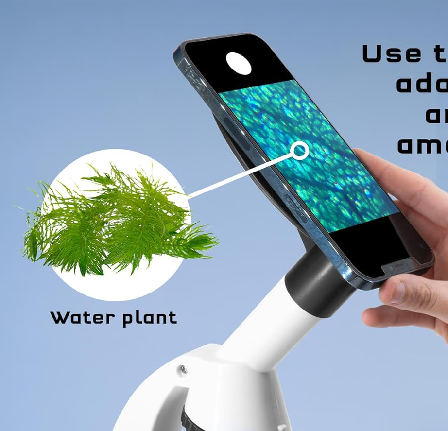 The microscope’s 15x ocular lens, or eyepiece lens, works together with the three objective lenses, resulting in a total magnification power of 60x, 150x, or 600x. The microscope has a battery-powered LED light to illuminate the specimens. The kit includes slides, cover slips, and many tools for collecting and preparing specimens. The included instruction manual guides you through using the microscope and the tools. The smartphone adapter is very flexible and works with virtually any smartphone.